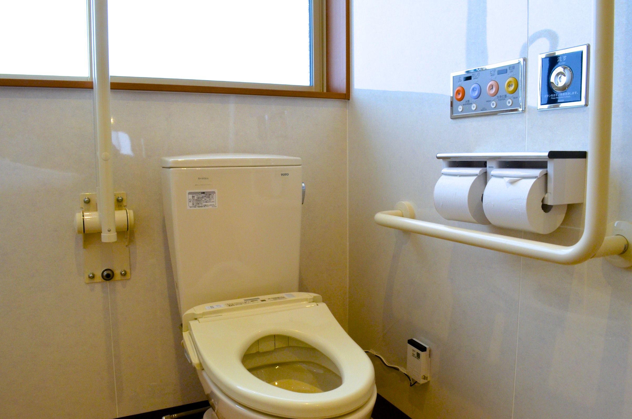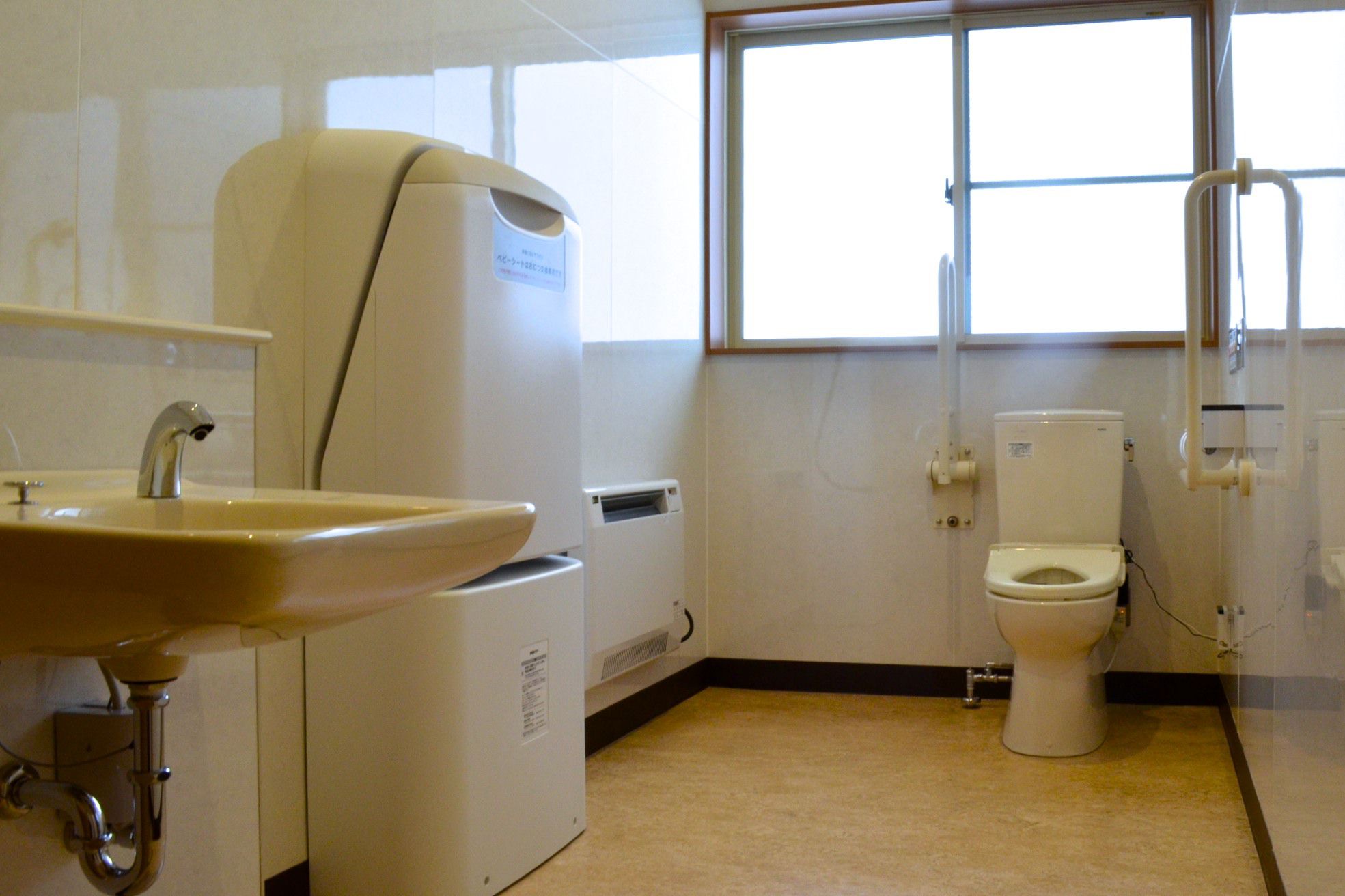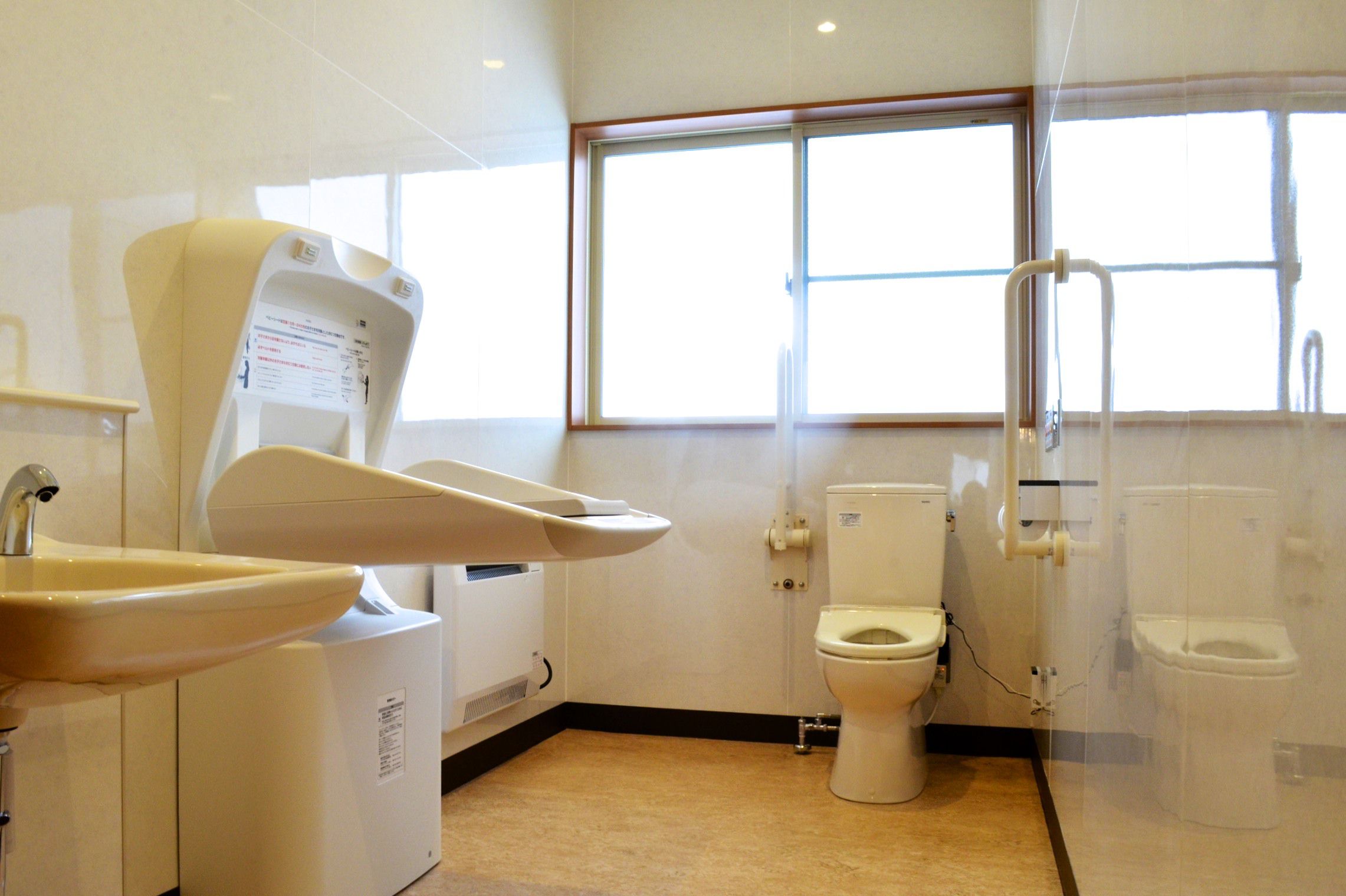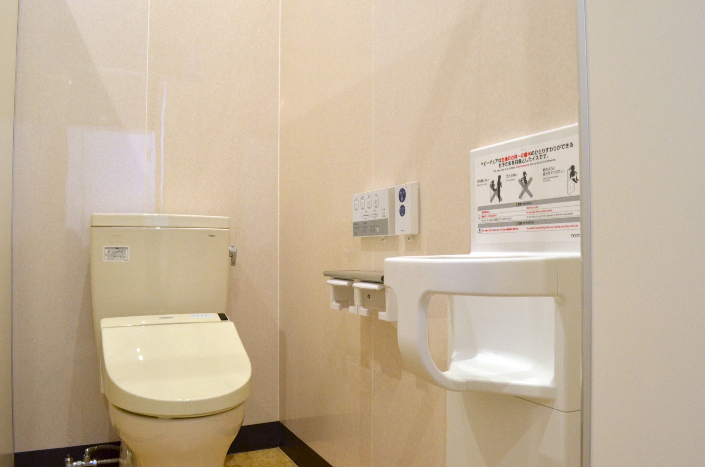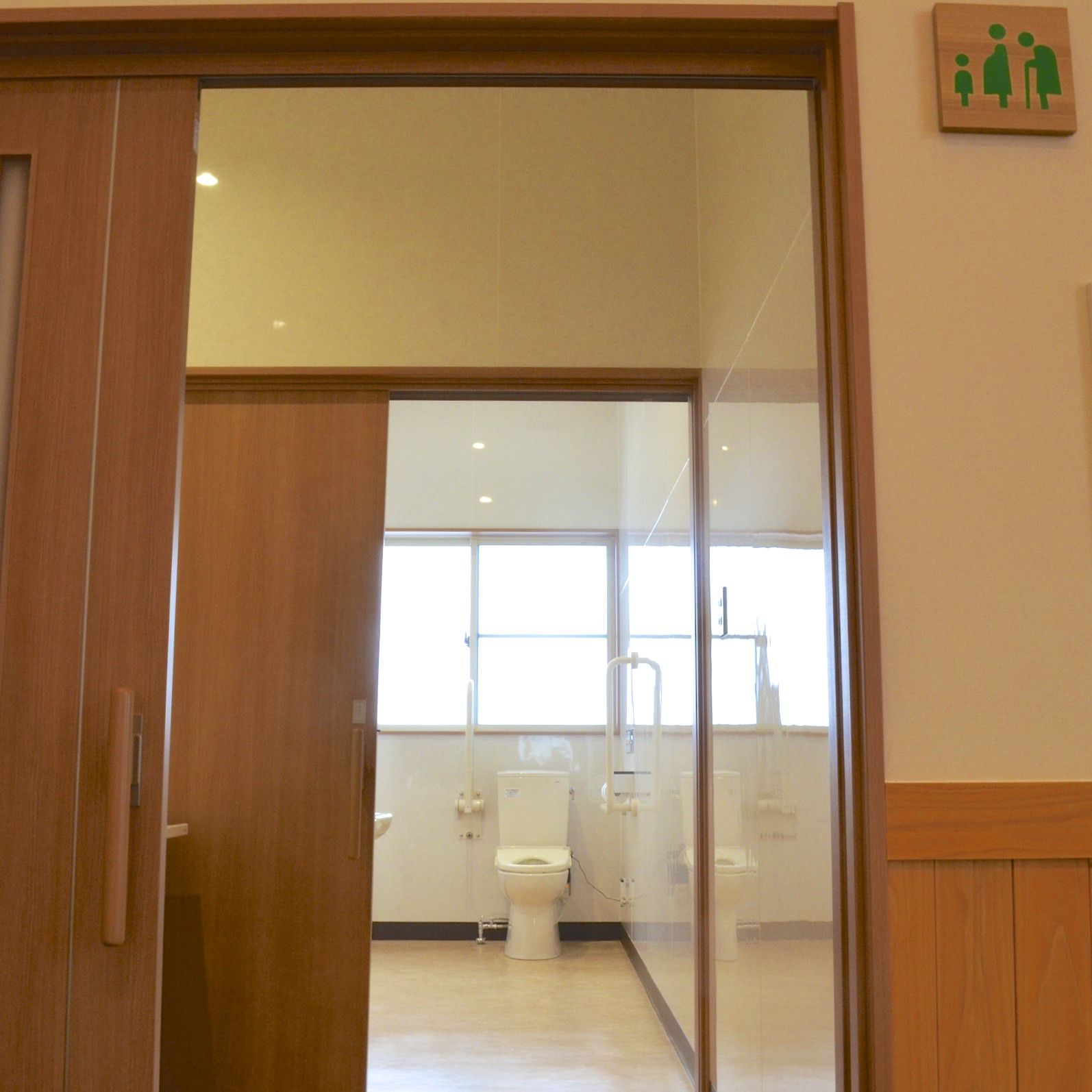 バリアフリー対応トイレは、車いすの方も安心してご利用いただけるよう広いスペースを確保しています。トイレ内での車いすの方向転換も可能です。