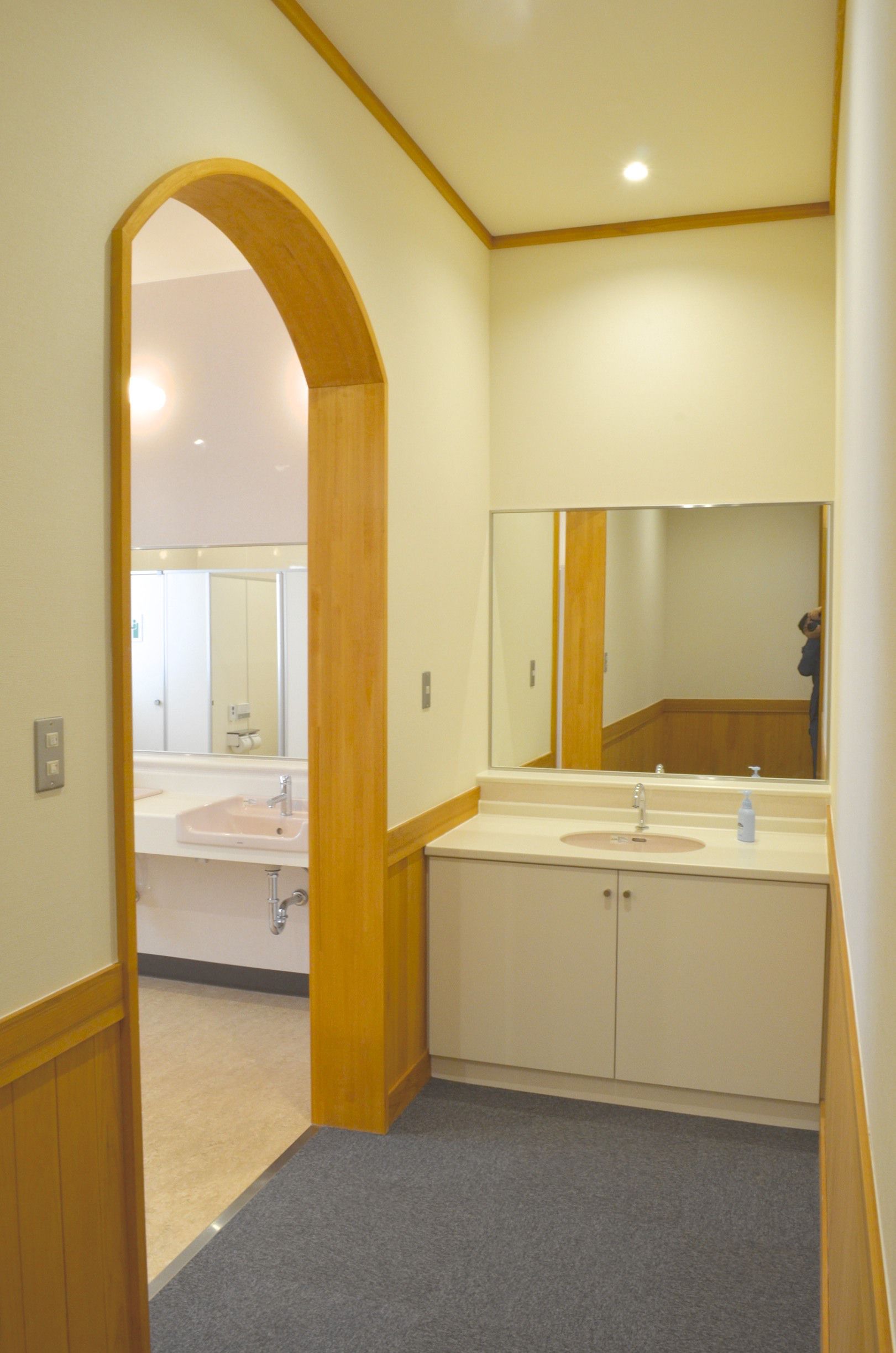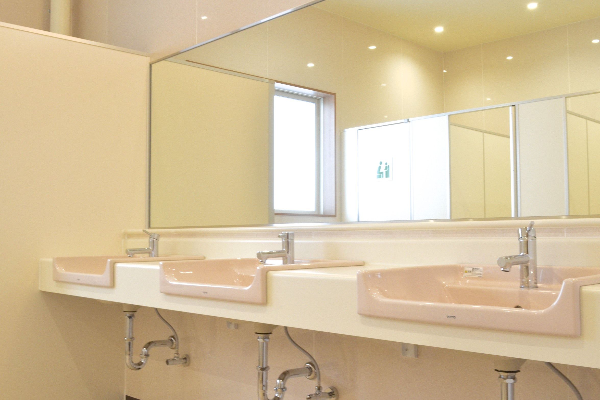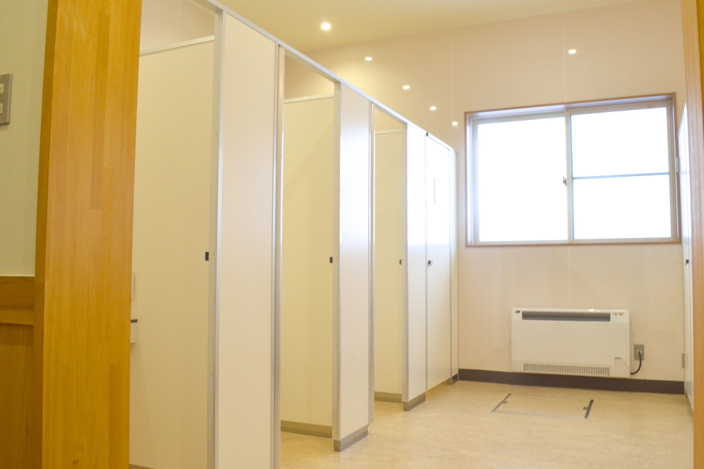 天童高原地域交流センターのトイレはスキーウェアのお客様でも楽々ご利用いただけるよう、広いスペースを確保しております。トイレはもちろんウォシュレット。そして女子トイレにはより大きな鏡と広い洗面台を設置いたしました。